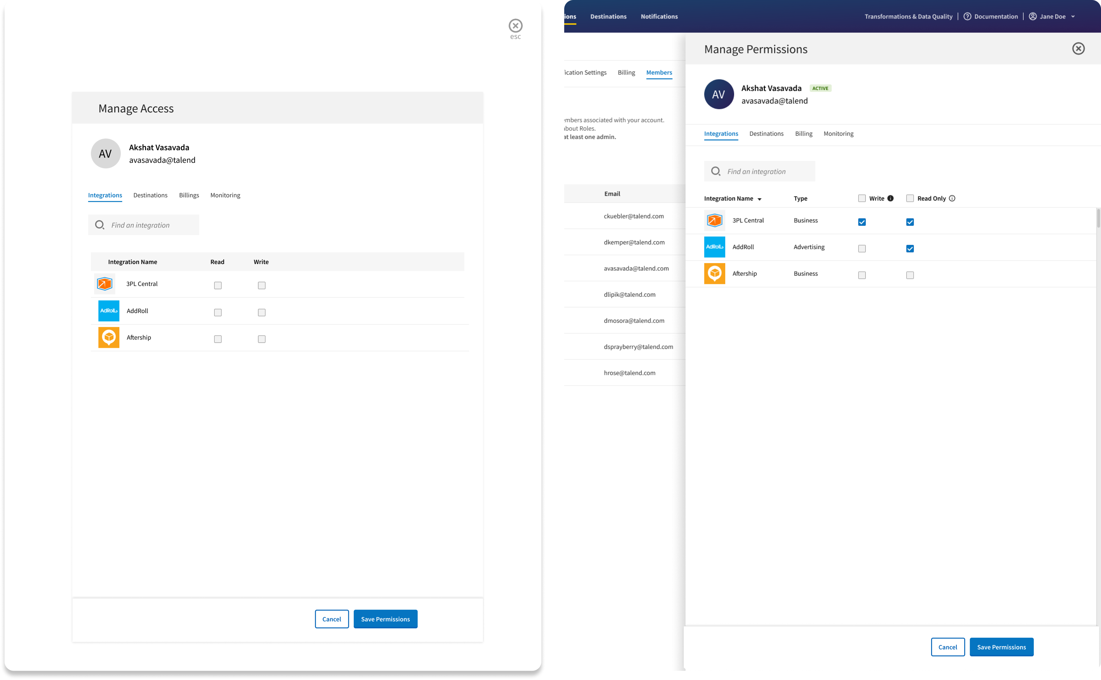 To address the need for flexible integration permissions, we devised a solution empowering admin users to assign distinct permissions, either granting full control or limiting access to a read-only view. We meticulously tested two implementations to determine the most user-friendly approach.